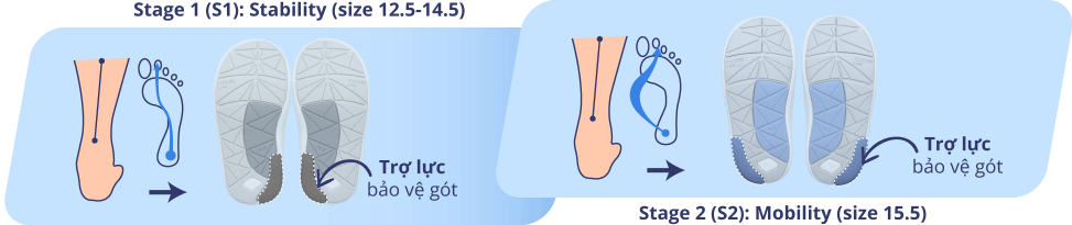 Phần trợ lực lòng bàn chân: bảo vệ hệ thống dây chằng bàn chân, thúc đẩy sự tạo vòm bàn chân, ngăn ngừa hội chứng bàn chân bẹt từ khi trẻ 2-3 tuổi.