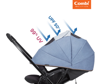 Để bảo vệ trẻ nhỏ khỏi các yếu tố môi trường như thời tiết, khói bụi. Chất liệu màn chụp Combi có khả năng chống mưa - chống tia UV - chống bụi bẩn. Thiết kế ghế xe đẩy cao lên tới 58cm, giúp cách ly bức xạ từ mặt đường.