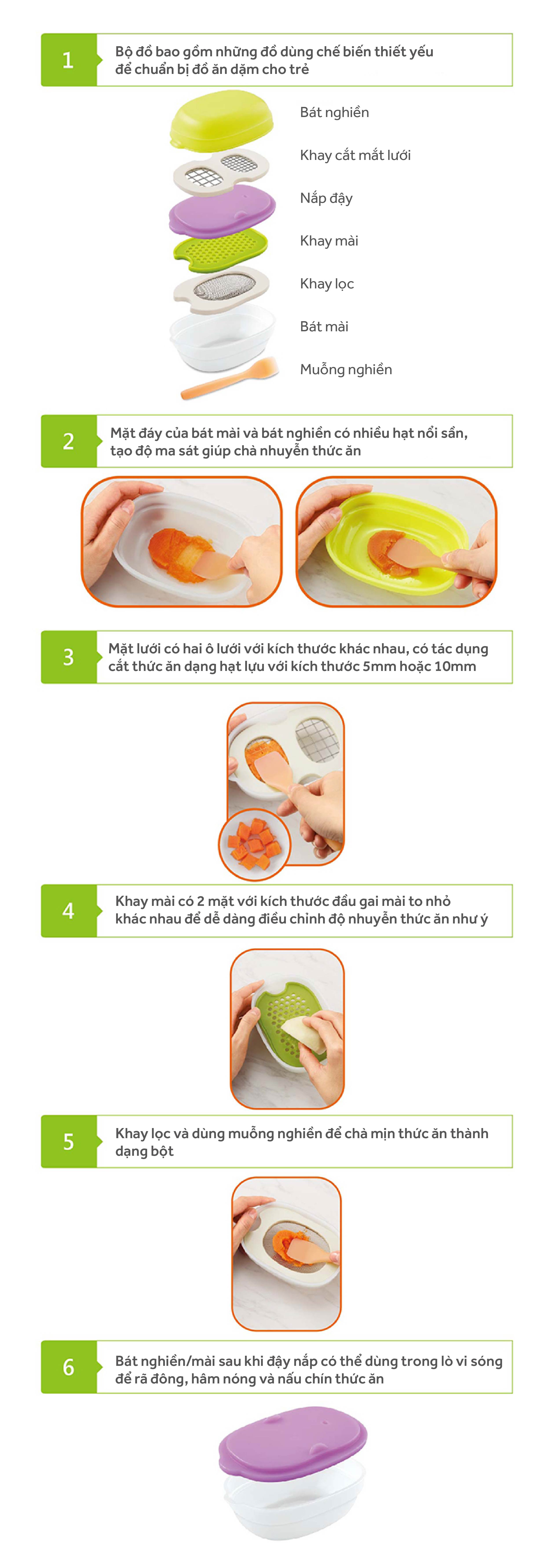 - Có thể tiệt trùng bằng lò vi sóng hoặc nước sôi, trừ khay cắt mặt lưới và khay lọc