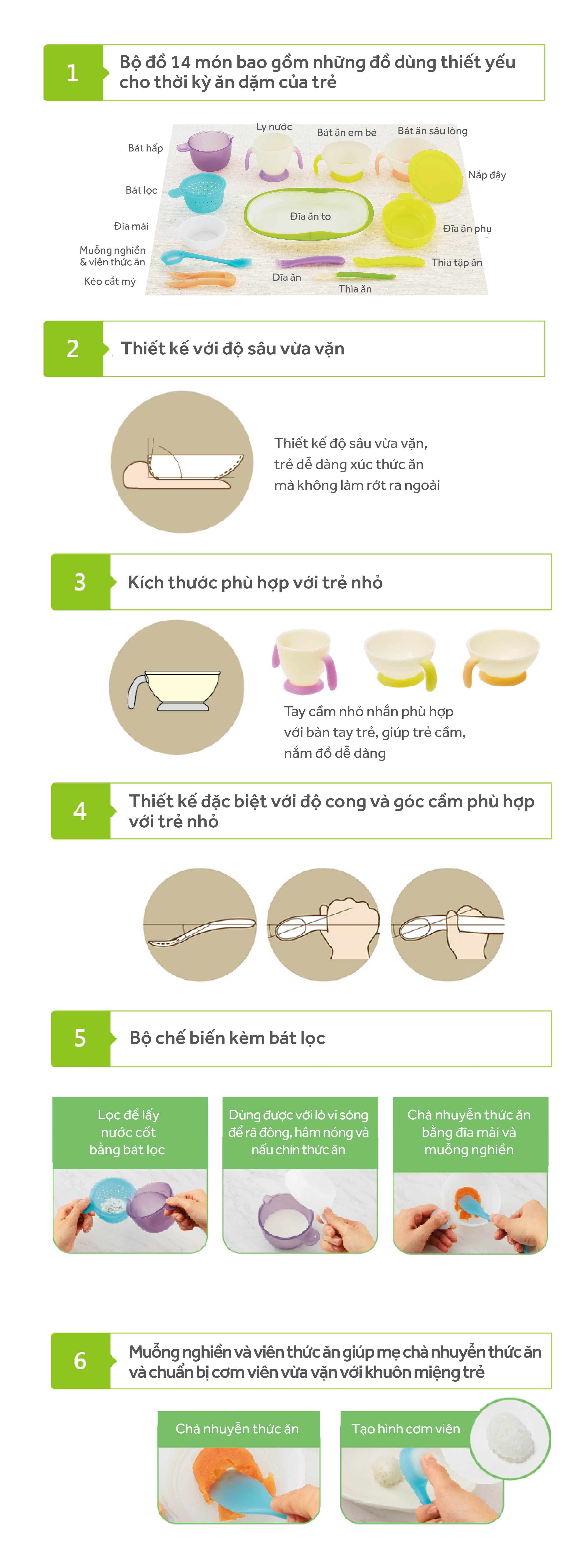Bộ đồ ăn tổng hợp 14 món Combi là sự lựa chọn hoàn hảo khi bắt đầu hành trình ăn dặm cho trẻ. Bộ đồ bao gồm các đồ dùng chế biến giúp mẹ dễ dàng chuẩn bị đa dạng các món ăn dặm và các đồ dùng ăn dặm với thiết kế kiểu dáng thông minh, màu sắc vui nhộn giúp bé thích thú vào hào hứng hơn trong mỗi bữa ăn.