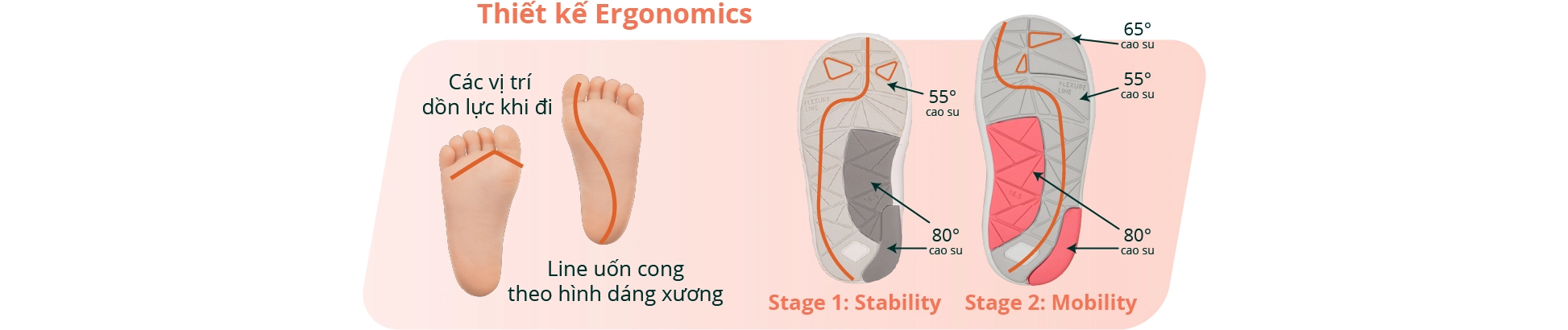Combi còn ứng dụng Ergonomic vào thiết kế Giày dựa trên đường cong phù hợp với hình dạng, cấu trúc xương ở từng độ tuổi.