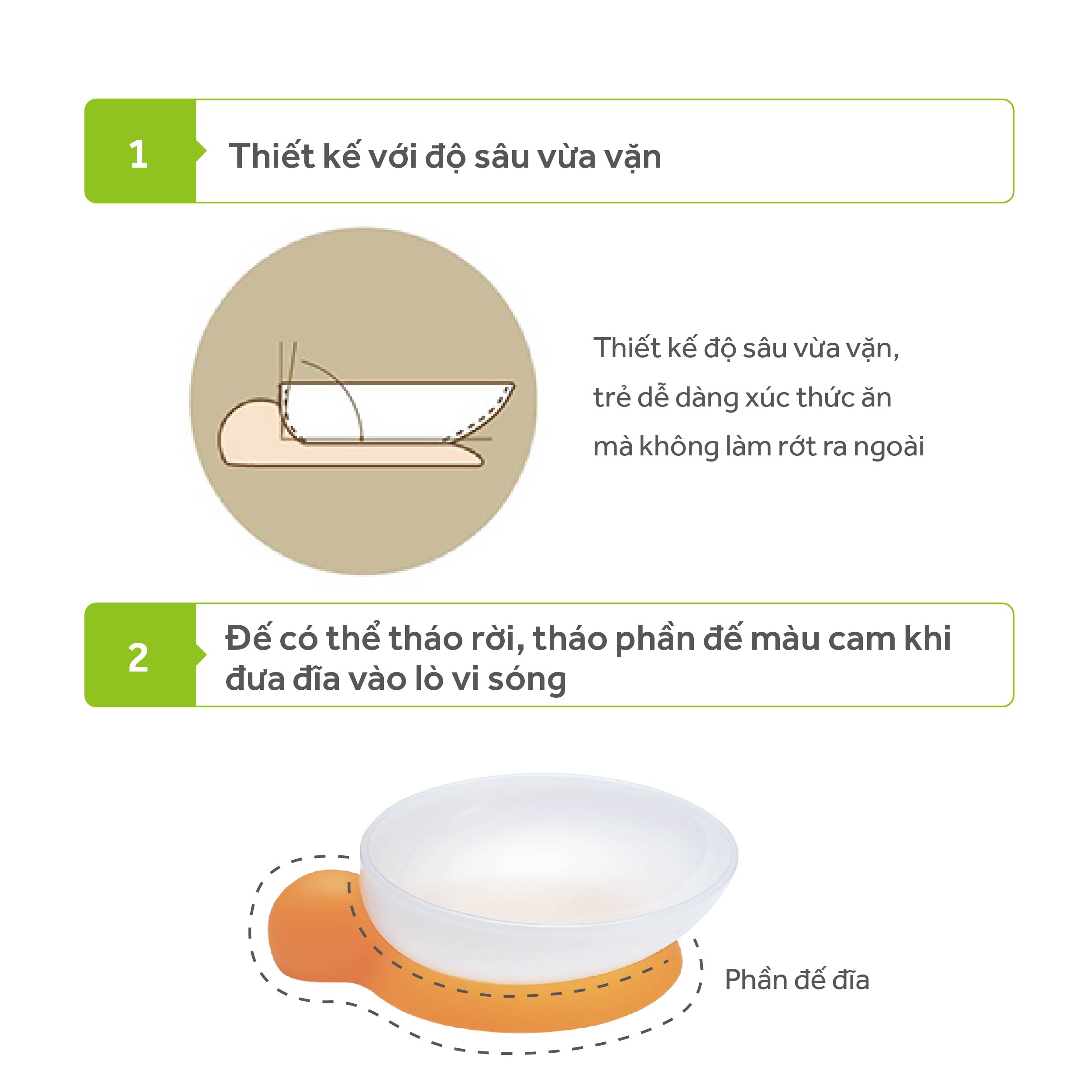 Đĩa ăn hình trứng Combi nằm trong bộ đồ ăn dặm Combi, với thiết kế kiểu dáng lòng sâu và nghiêng về một phía, bé có thể dễ dàng xúc thức ăn mà không làm rớt ra ngoài.