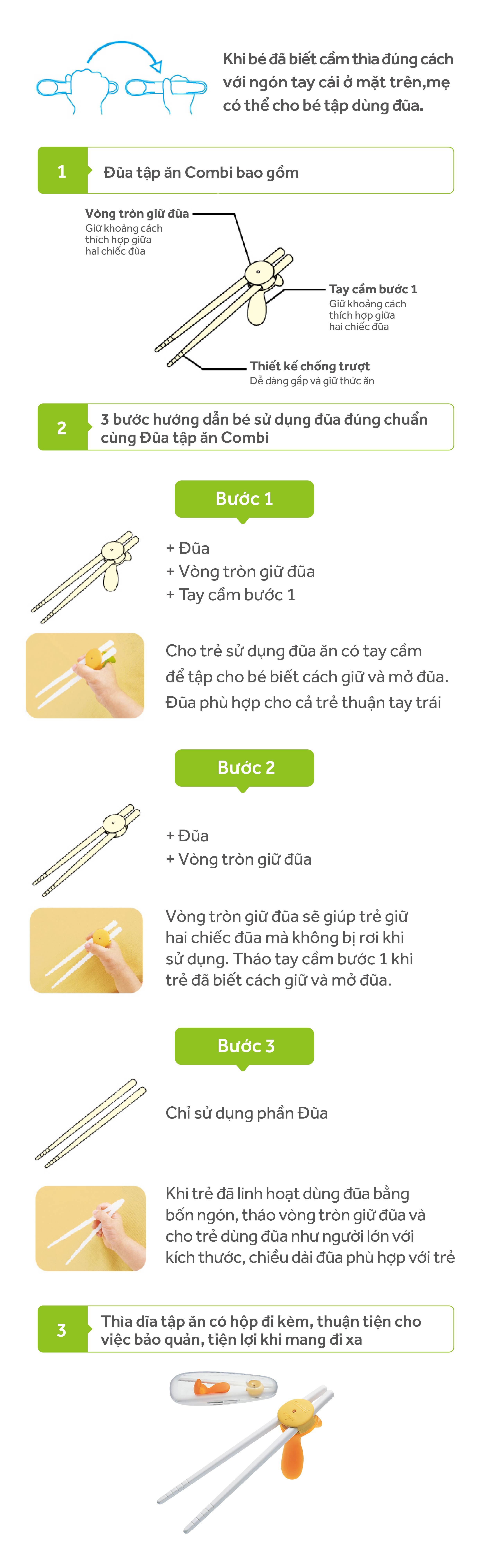 Đũa tập ăn được Combi được nghiên cứu và ra đời dựa trên một quá trình dài nghiên cứu trên các em nhỏ tập ăn bằng đũa và kết luận là: Để tập luyện cho bé quen với việc sử đụng đũa một cách dễ dàng, điều quan trọng là phải đảm bảo tất cả các ngón tay của bé đều phải ở đúng vị trí.