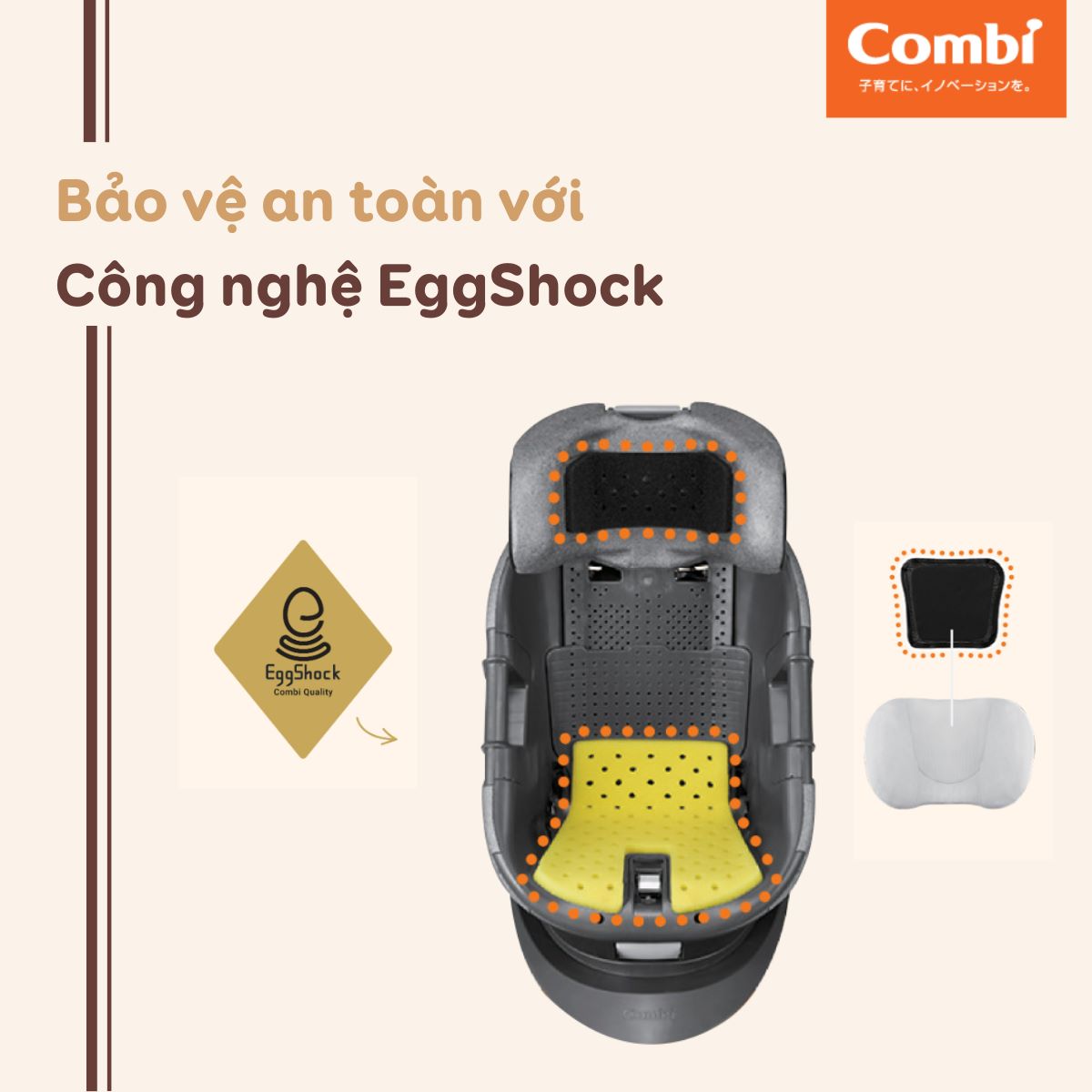 Công nghệ Eggshock là tinh hoa của Combi, giúp hấp thu, phân tán lực hiệu quả và làm giảm 30% va đập, ngoại lực lên cơ thể bé so với sản phẩm không có Eggshock. Điều này đảm bảo rằng trẻ em sẽ được bảo vệ toàn diện khỏi mọi rung lắc, và giảm tối đa những chấn rung có thể xảy ra khi phanh gấp hoặc xảy ra va chạm.