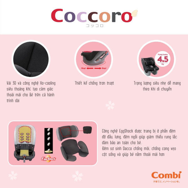 Được trang bị đầy đủ đệm Dacco và công nghệ Eggshock, Ghế ô tô Coccoro EG là sản phẩm lý tưởng cho hành trình đầu tiên của bé cùng gia đình thật an toàn và thật vui!