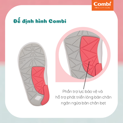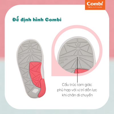Dựa trên nghiên cứu khoa học về cấu tạo xương bàn chân của trẻ em châu Á, sự thay đổi trong dáng đi của trẻ theo độ tuổi, Combi mang tới sản phẩm Giày Đế định hình - độc quyền sáng chế giúp bảo vệ và hỗ trợ sự phát triển xương bàn chân, mang tới cho trẻ những đôi giày tập đi góp phần cho bé những bước đi đầu đời thật khỏe mạnh, vững vàng.