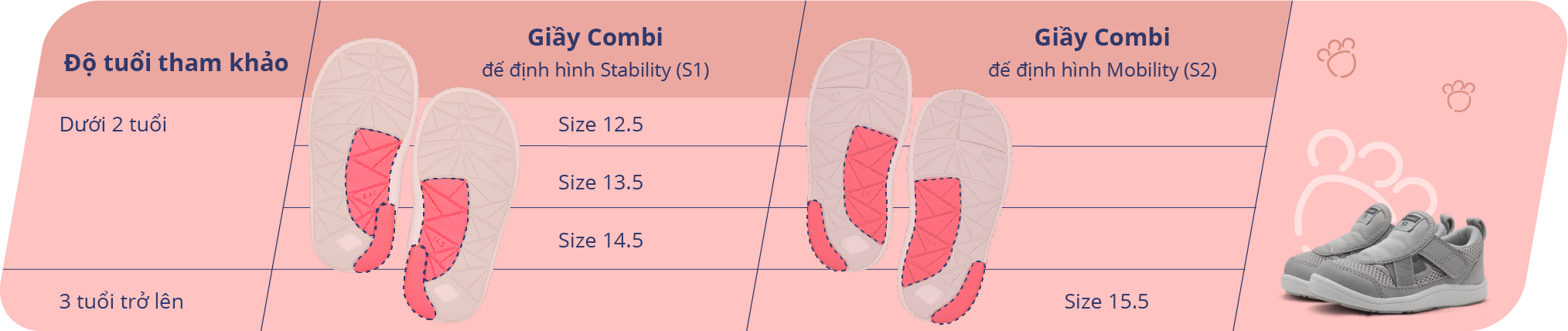 Với đặc điểm riêng của trẻ trong từng giai đoạn, Combi mang tới 2 dòng giầy với ĐẾ ĐỊNH HÌNH được thiết kế chuyên biệt cho từng độ tuổi: