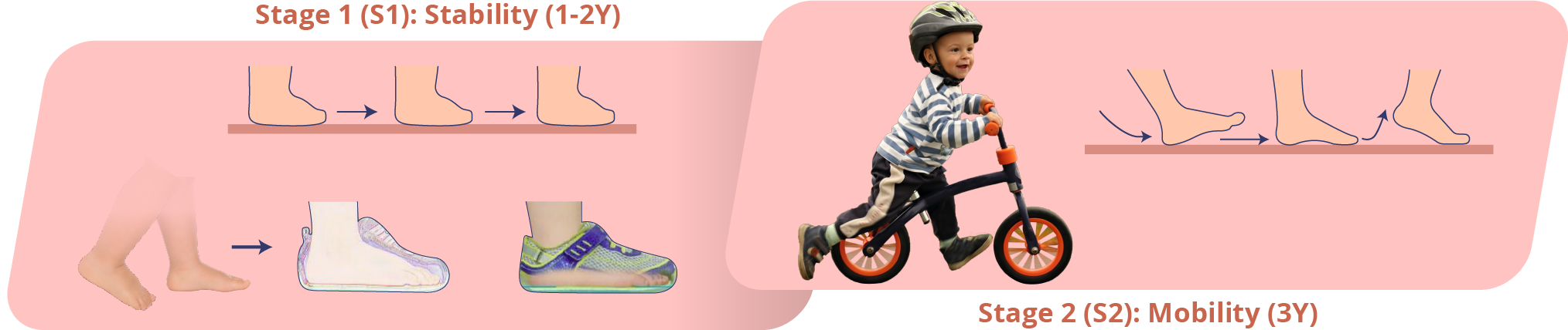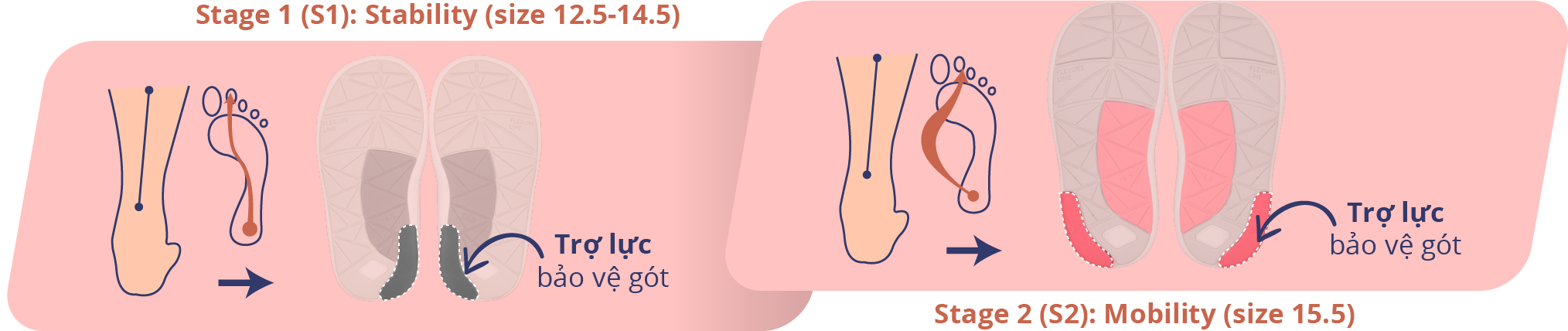 Phần trợ lực bảo vệ gót được đặt ở các vị trí khác nhau cho từng nhóm tuổi, dựa trên sự khác biệt về dáng đi, độ lật vào trong (má trong) của gót và lòng bàn chân khi trẻ đi/chạy.