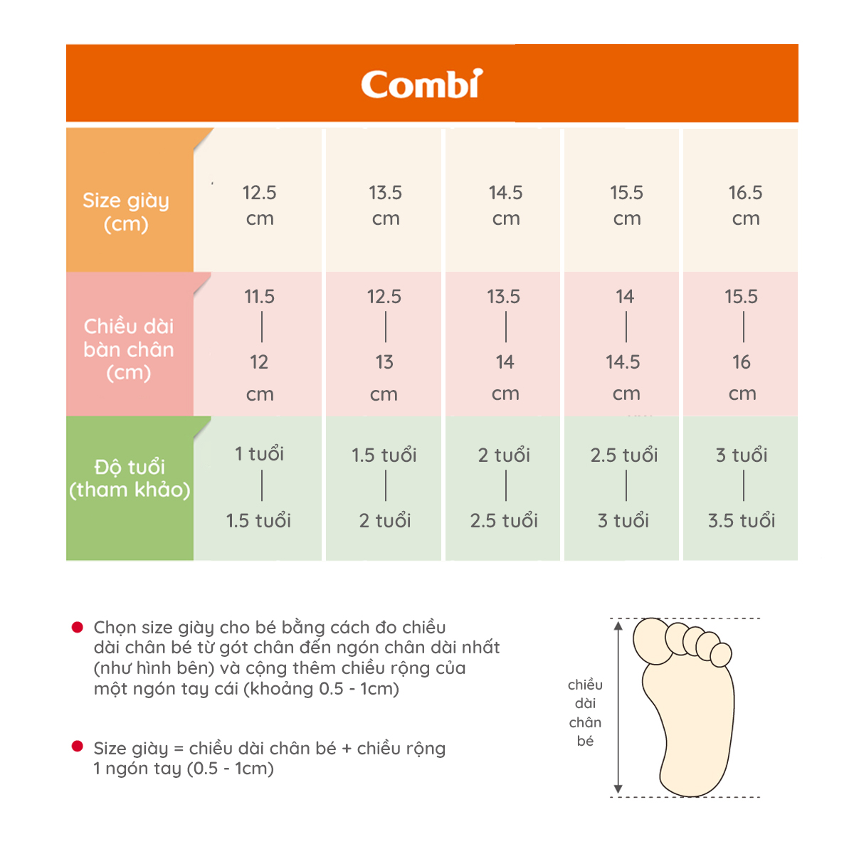 Size: 12.5 - 13.5 - 14.5 - 15.5 - 16.5 (số size được tính bằng độ dài bàn chân bé, đo bằng cm)