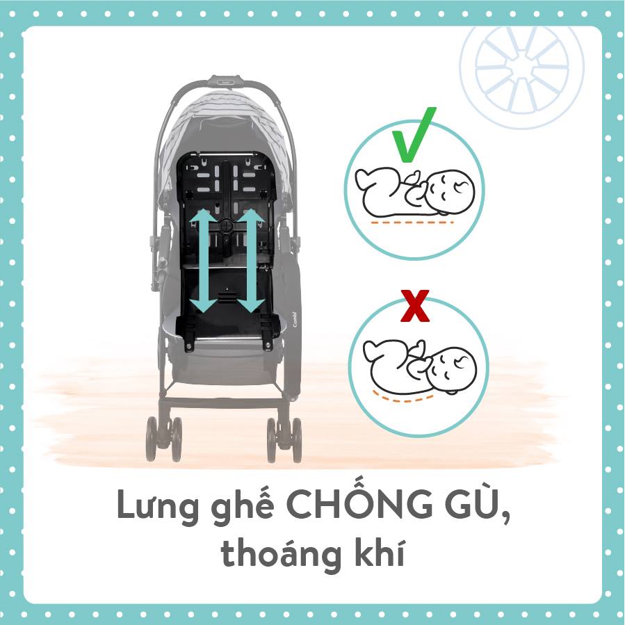 Giải pháp là xe đẩy chống gù có lưng ghế bằng nhựa hoặc vải căng chắc chắn KHÔNG BỊ CHÙNG/VÕNG giúp nâng đỡ toàn bộ trục xương sống. Nhờ vậy, bé nằm thoải mái trên một mặt phẳng và không bị cong/gù lưng, tạo đường thở tối ưu. Một số dòng xe đẩy chống gù có trang bị phần lưng đỡ bằng nhựa có nhiều lỗ thoáng khí nên ngay cả vào mùa hè, đệm xe cũng không bị bí nóng.