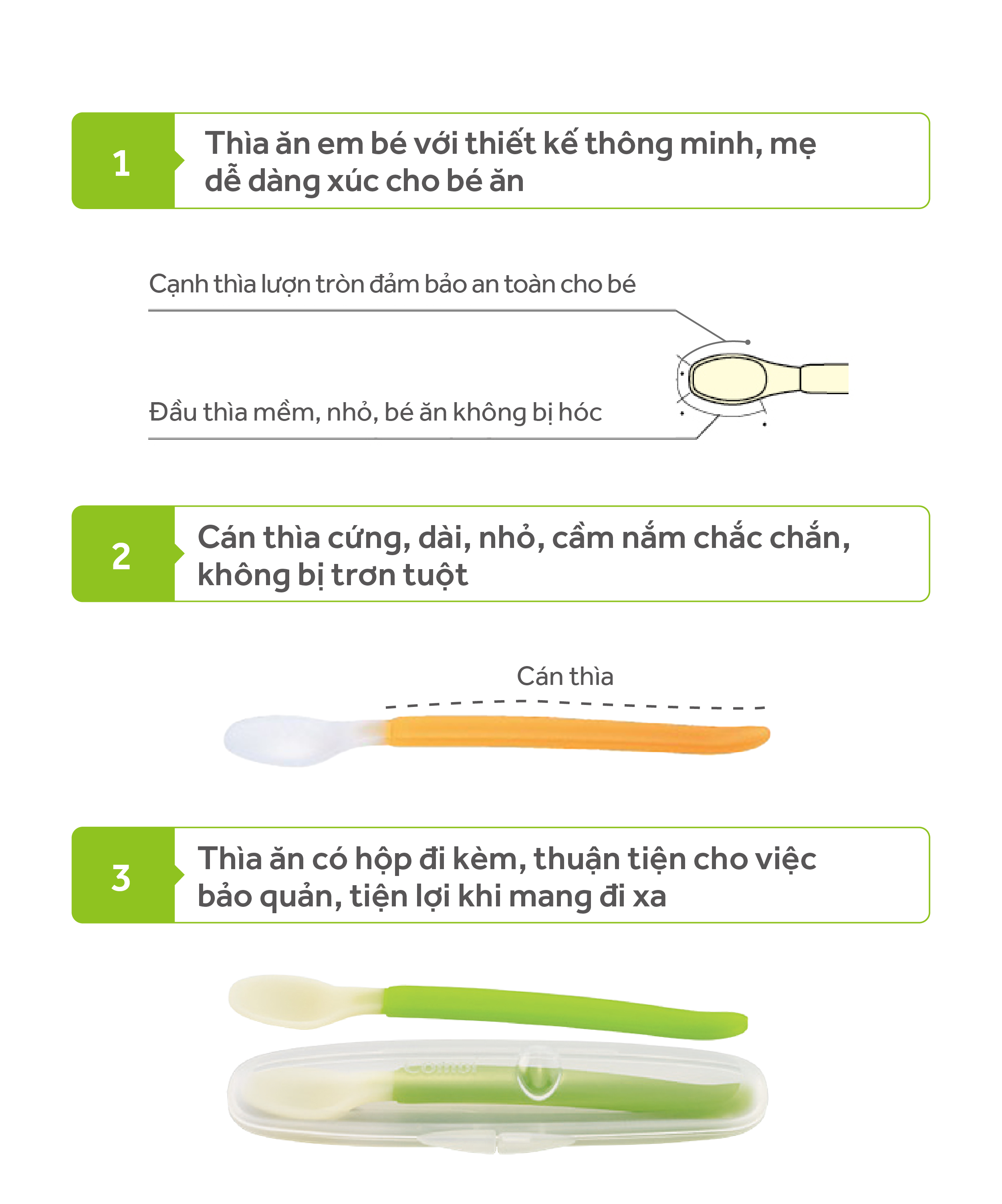 Thìa ăn kèm hộp Combi với thiết kế đầu thìa an toàn, cán dài, chắc chắn, mẹ cho bé ăn dễ dàng. Thìa ăn có hộp đi kèm thuận tiện cho mẹ mang theo bên người.