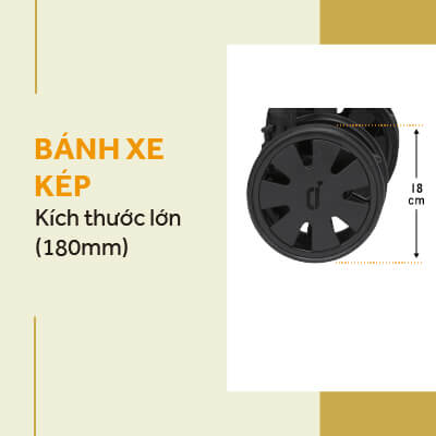 - Bánh xe kép, kích thước lớn (180mm) giúp mẹ và bé lướt thêm êm, di chuyển uyển chuyển. Thiết kế nan hoa của bánh xe độc đáo, mới lạ tăng phần thu hút.